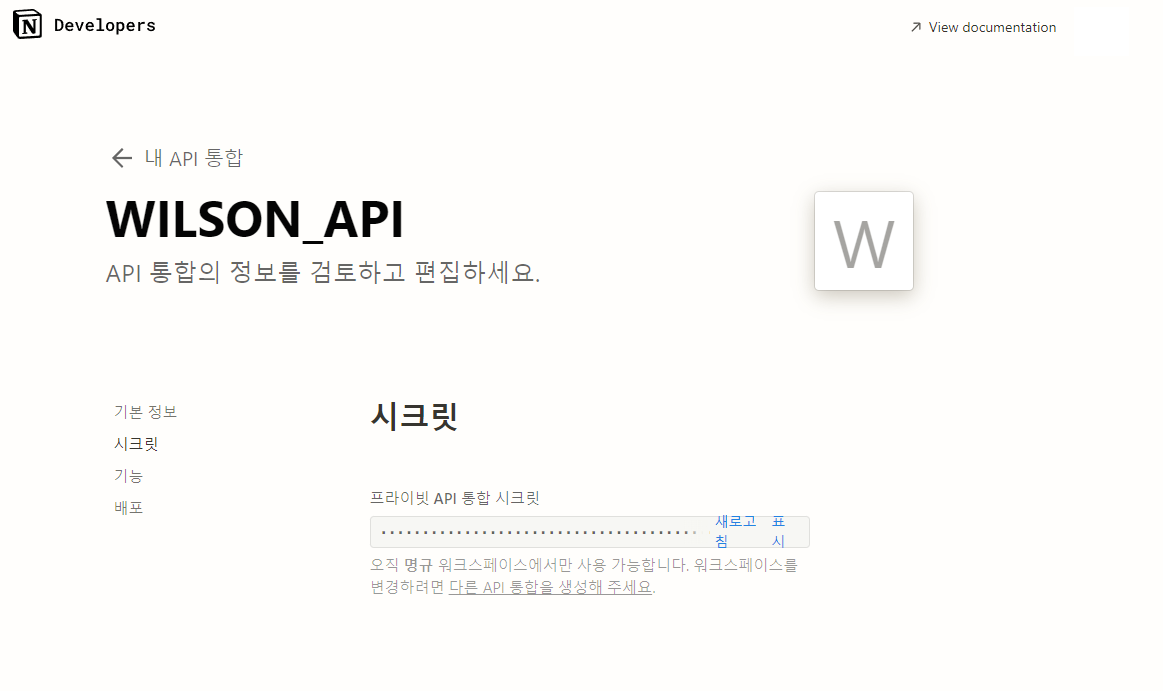 표시 버튼을 누르면 프라이빗 API 통합 시크릿 키가 보여진다